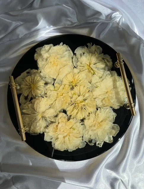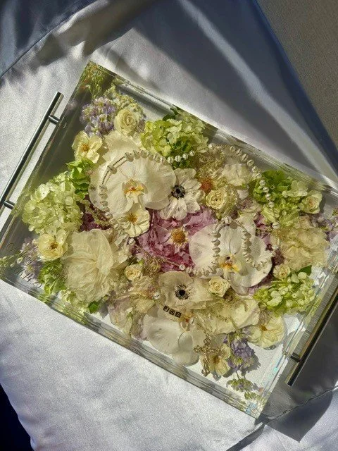 Valerie emphasizes that her work is more than just a craft—it is a delicate balance of artistry, storytelling, and technical precision. Each piece begins with a careful design process, where she visualizes the layout and composition of the preserved flowers, ensuring the finished piece is both beautiful and meaningful. “You can throw flowers in a mold and preserve them, but the way I design them, I want it to look like art and tell the story of the day,” she says.
