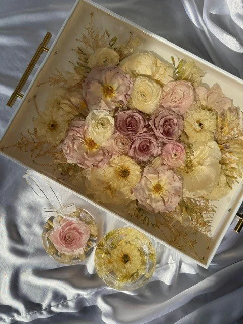 “It was my first real attempt at flower preservation,” Valerie explains. “I had to learn new techniques and even find the right type of resin. But when it came out beautifully, I knew I had found a direction I wanted to pursue.” Today, flower preservation forms the core of her business, though she still creates a variety of resin items for her clients.