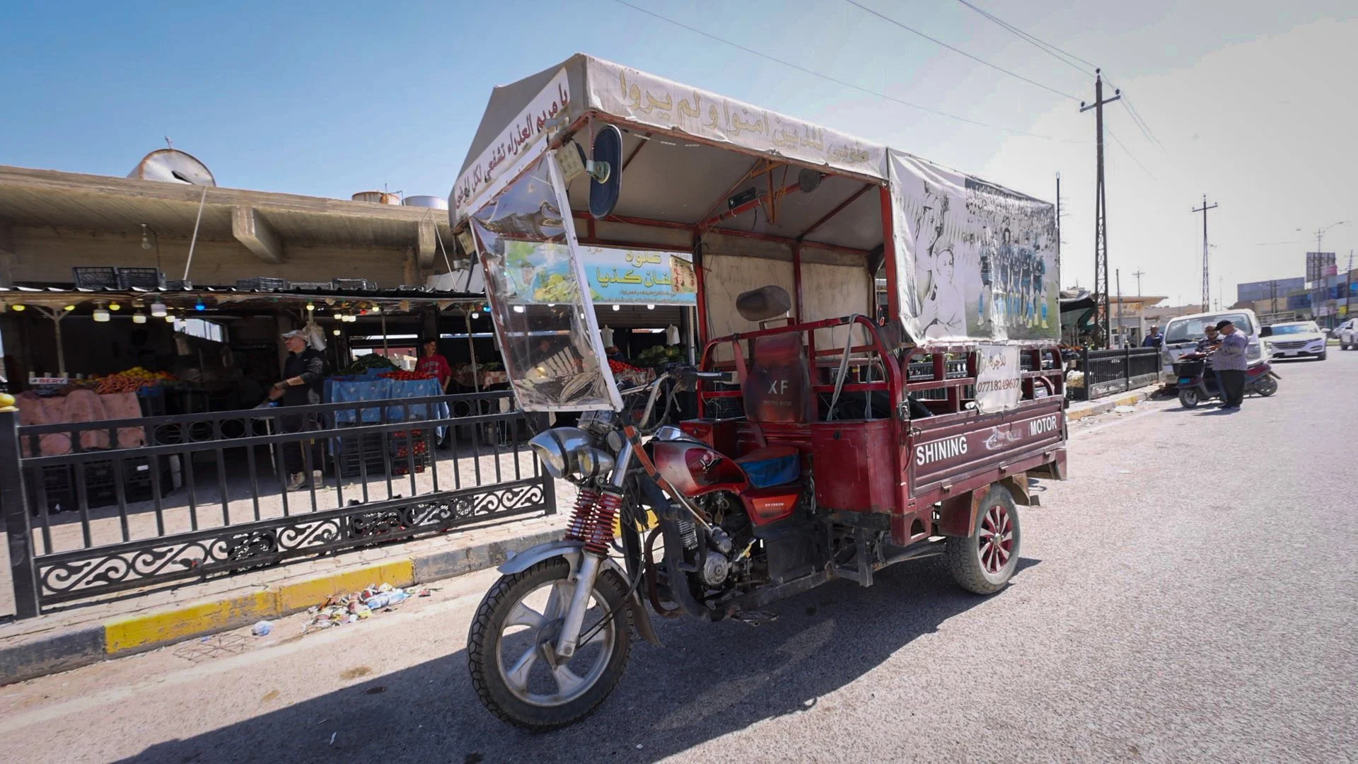 A three-wheeled motorcycle is used as a pickup truck or a taxi. Although the streets are crowded, these motorcycles can maneuver quickly and save on gas. Most of the population of Baghdida are Christians; this gives drivers the confidence to post Christian pictures and verses from the Bible on their vehicles.